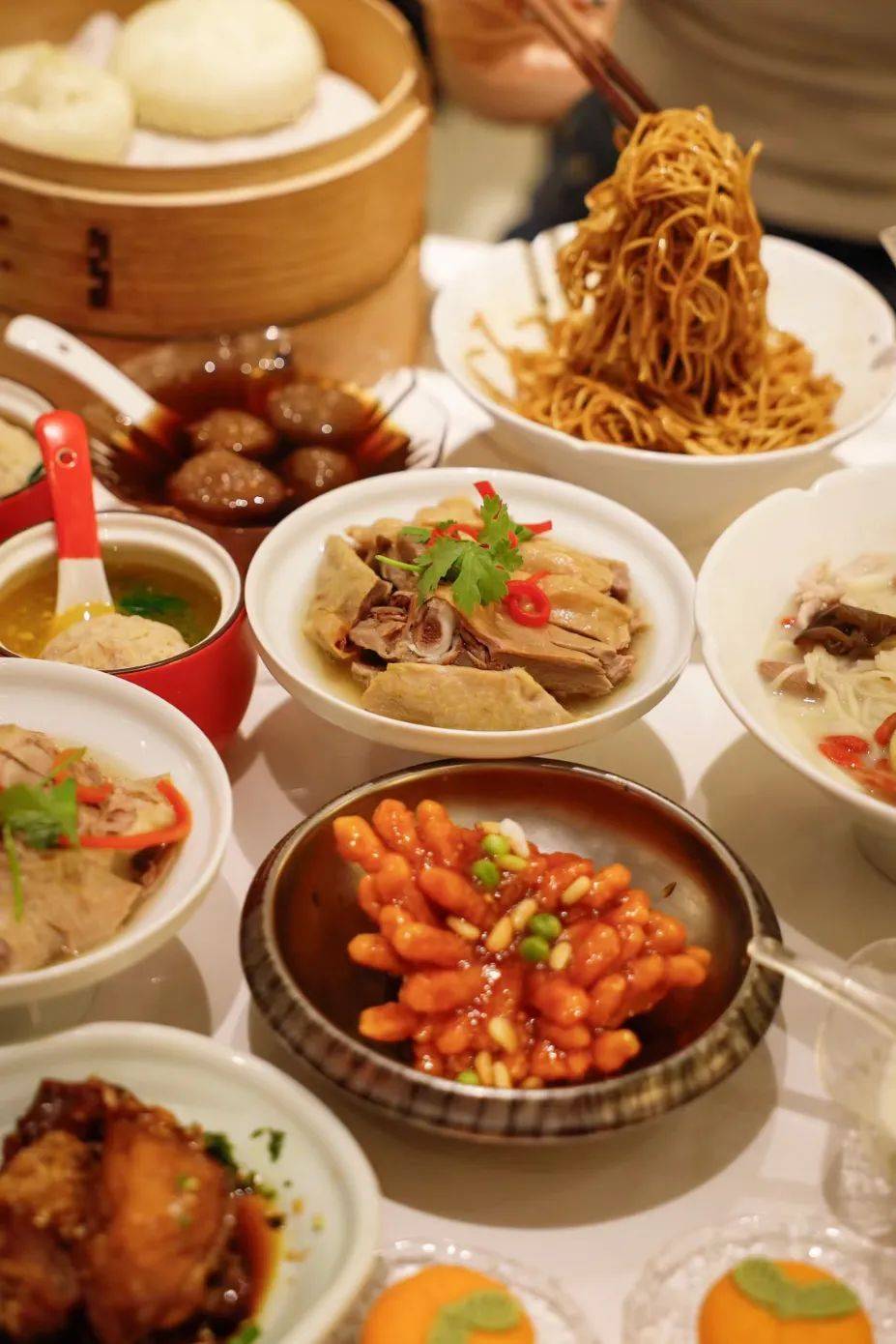 如果说东北菜里的硬菜,是最能镇得住场面的一道肉菜,在广东酒席上,硬菜就是一道接一道。开席先上个鱼翅炖盅,老火汤装完,还要把汤渣捞出来自成一碟。吃到冷盘,最能代表广东特色的硬菜白切鸡永远不会缺席;龙虾焗伊面、清蒸老虎斑、葱香大乌参、生猛竹节虾、开片蒸澳龙,大气的海鲜河鲜,谁都不愿当谁的陪衬;到了酒席的最后,还必须有木瓜炖雪燕等糖水、焗包和果盘,甜甜蜜蜜收个尾。但广东人的宴席,却基本不收高额红包,收了客人的红包,主人家大多都只是折个角,表示心领了。都说广东酒宴道道硬菜,但想来最“硬”的,是主人家一颗要客人吃好喝好的心。