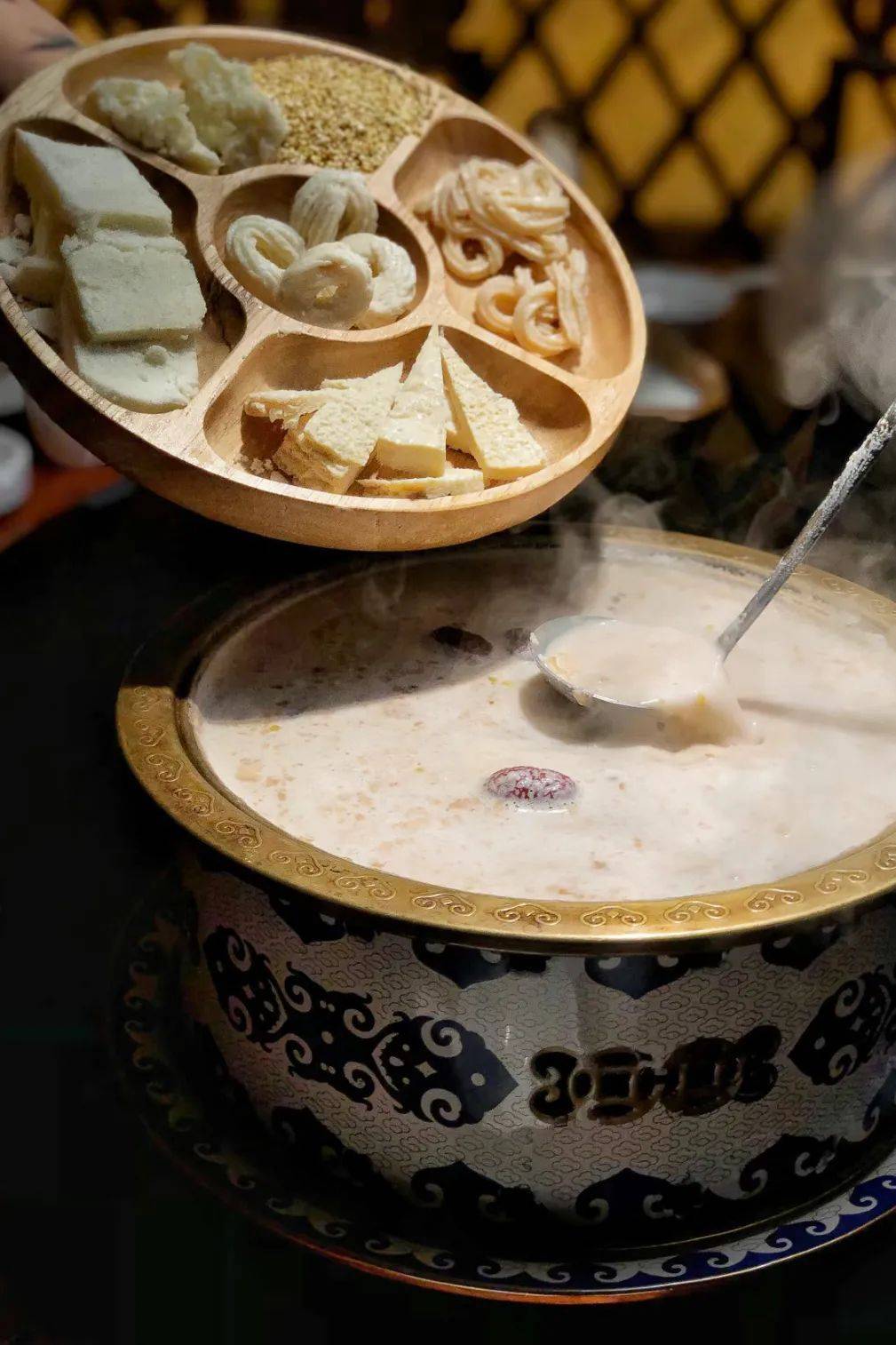 ▲ 在内蒙,点一两烧麦,指的做烧麦皮一两干面的重量。再加上小桌上堆积如小山的奶砖、奶酪、奶豆腐、奶皮子、酸奶等各种奶食,还有主人家从大暖壶里倒出来的、一碗热腾腾的奶茶,都让食客的肚皮应接不暇。以至于在内蒙饱食物羊肉的外地朋友非常矛盾:“在内蒙,好像这辈子的羊肉都吃够了,但是离开内蒙后又苦恼,以后吃不上可怎么办啊?”